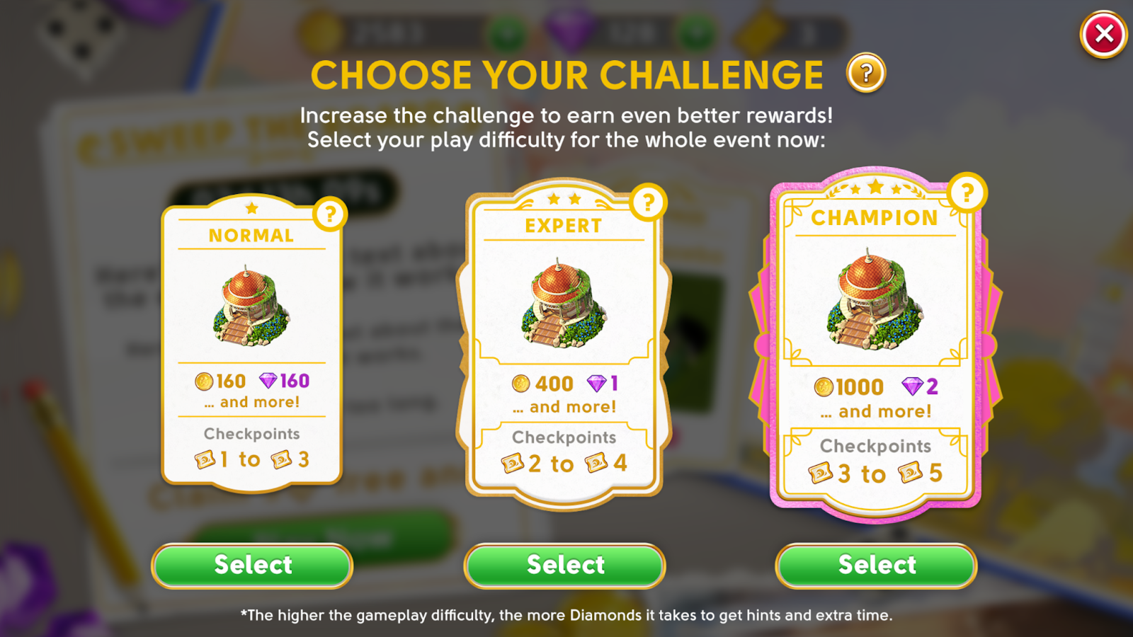 Større belønninger betyder selvfølgelig større udfordringer. Du skal bruge flere spilbilletter for at passere hvert enkelt kontrolpunkt, og der vil være flere trin mellem dem. Desuden vil det koste flere diamanter, hvis du aktiverer et hint eller vælger fortsæt.