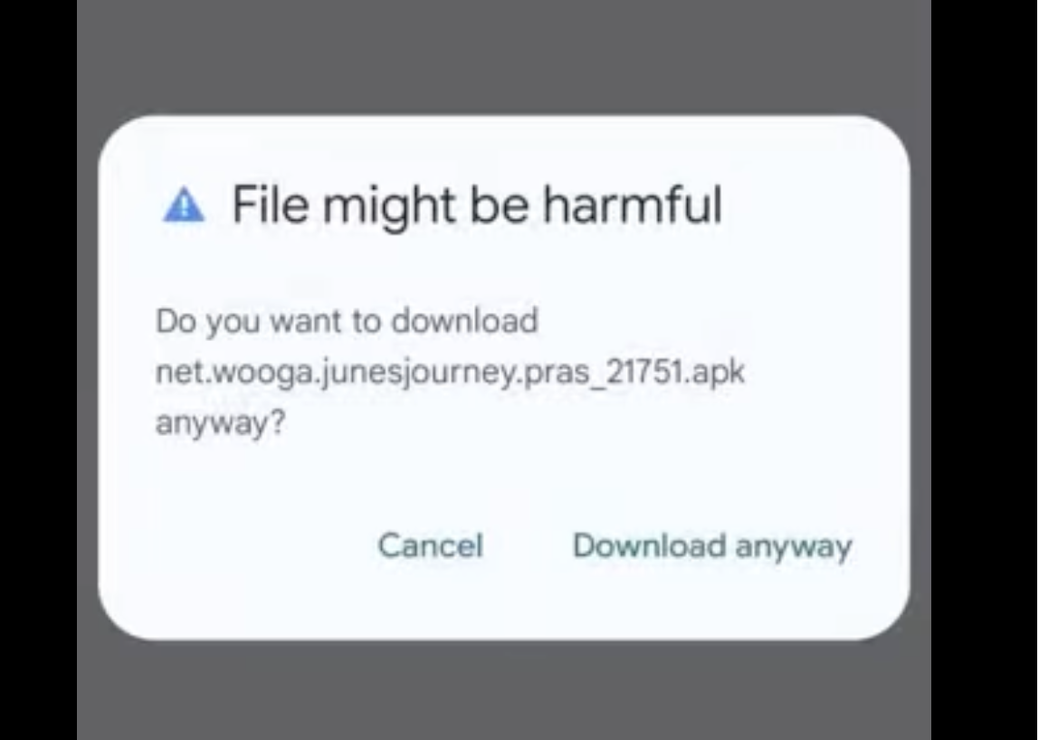 A warning pop-up from Google may appear saying “File might be harmful”. This is standard for apps outside Google Play. The file is safe to download, and you can select the option “Download anyway”.
