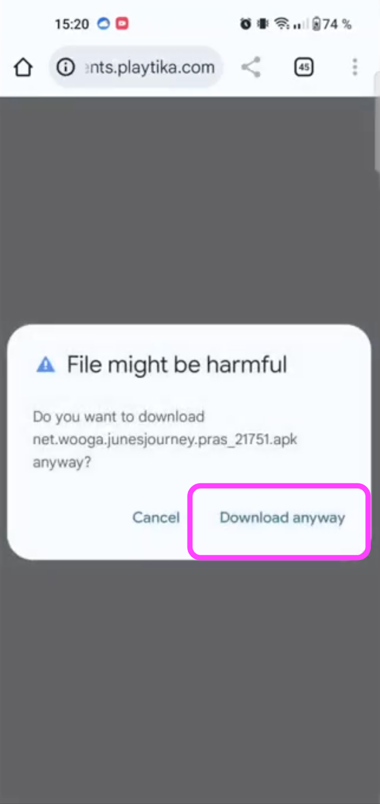 A warning pop-up from Google may appear saying “File might be harmful”. This is standard for apps outside Google Play. The file is safe to download, and you can select the option “Download anyway”.