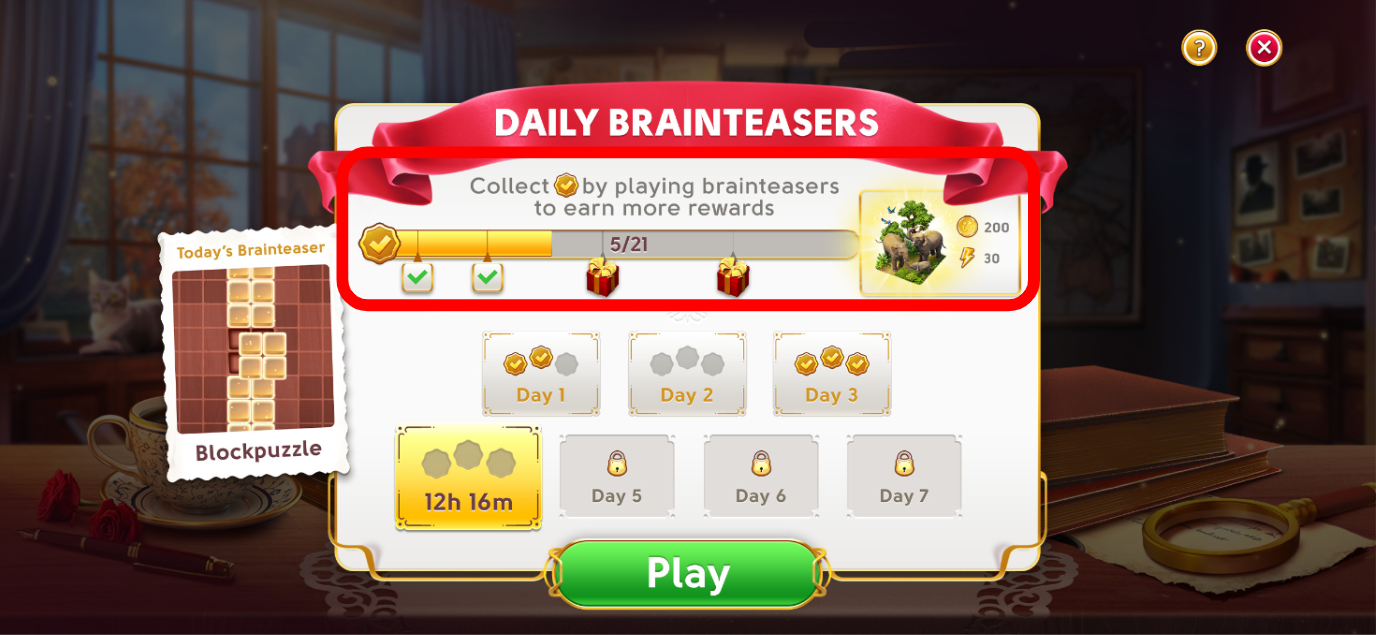 Si le prix final des casse-tête de la semaine est hors d'atteinte, ne vous inquiétez pas ! Une nouvelle semaine et de nouvelles récompenses vous attendent. En attendant, vous pouvez toujours recevoir des récompenses en gagnant trois jetons de talent et vous pourriez encore obtenir des récompenses de progression.