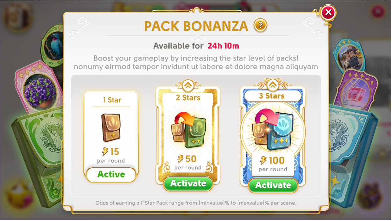 拼圖包特惠的 2 星和 3 星選項,可在回合結束時升級回憶錄拼圖包!不過,這項功能不會使關卡中出現更多拼圖包,只會在關卡結束時提升拼圖包的星級。舉例來說,若您啟用了 2 星特惠,完成關卡後至少會獲得 2 星拼圖包。如果啟用了 3 星特惠... 獎勵就更豐富了!特惠越高,獎勵就越豐富!