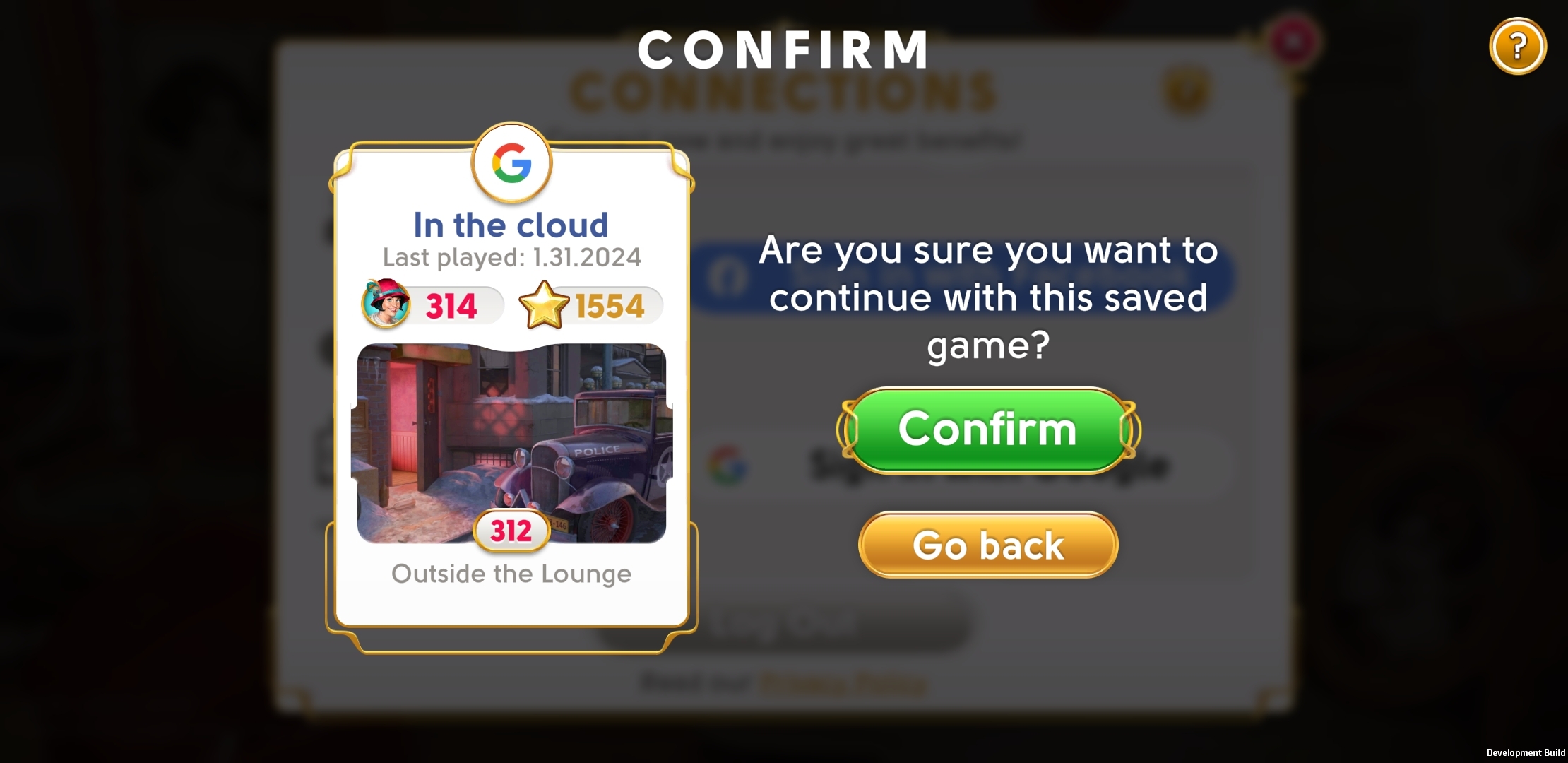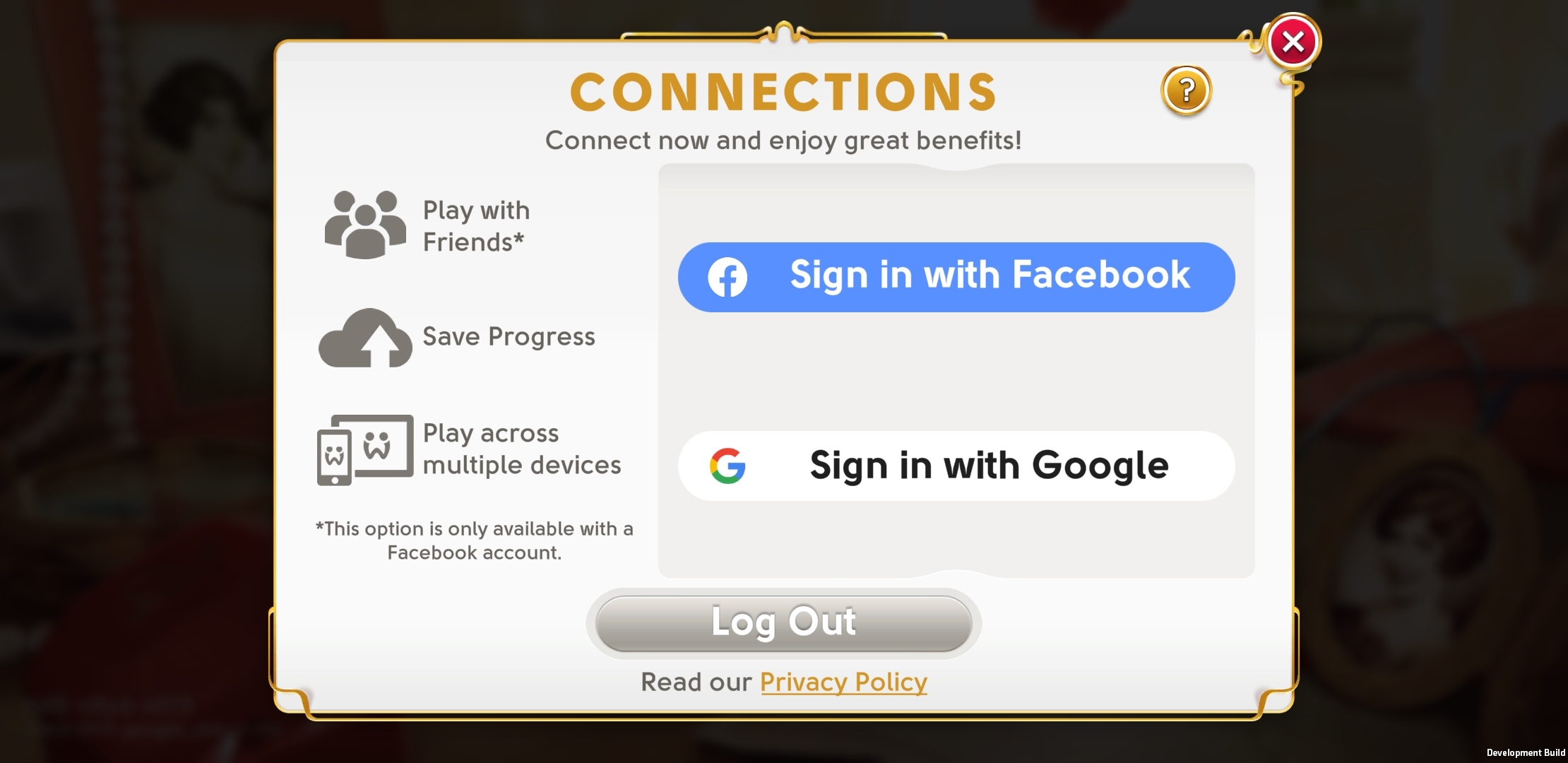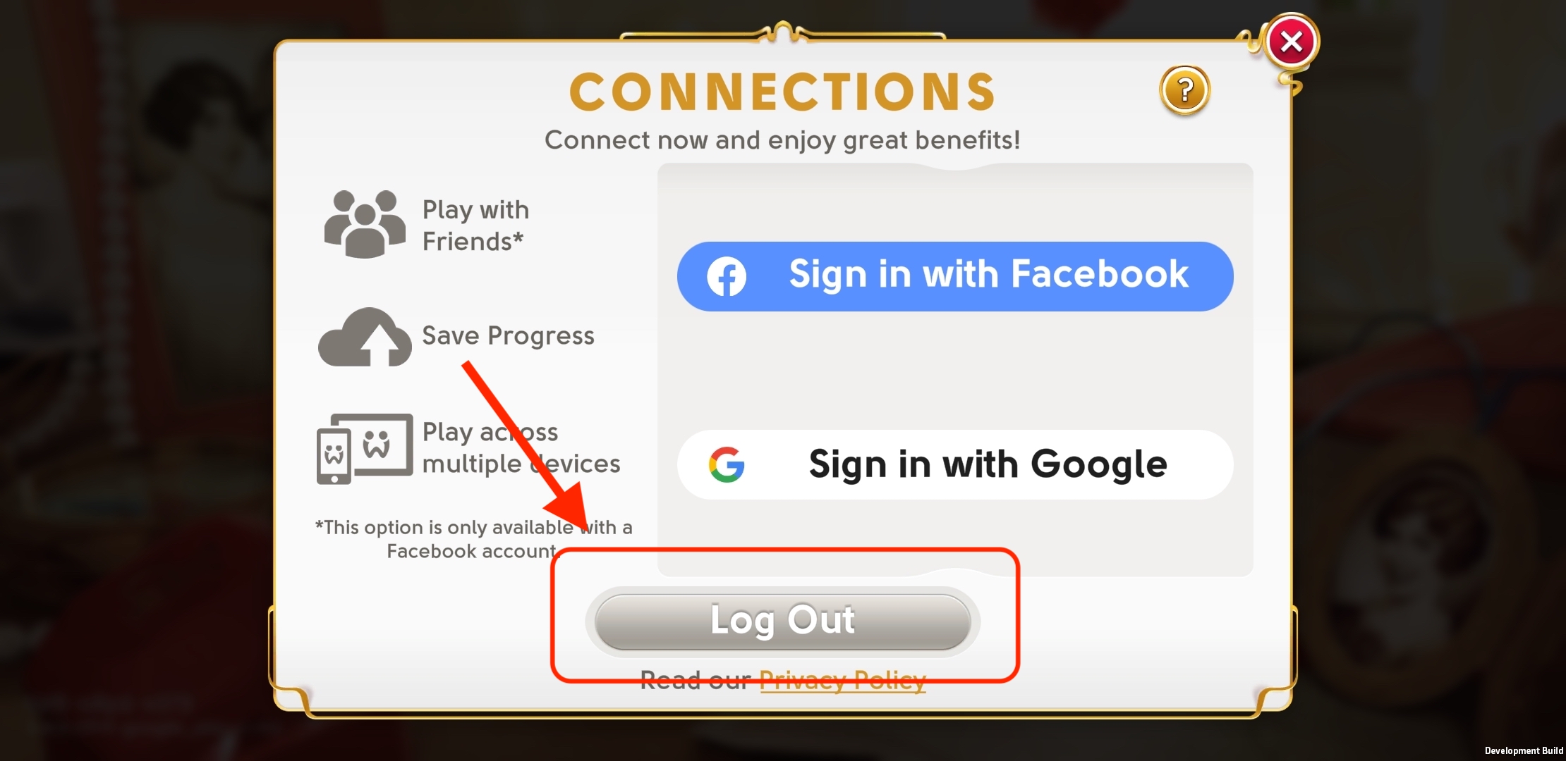 如果您在“连接”弹出窗口中点击“注销”按钮,您就会登出游戏,您的游戏也不会继续与您的 Google ID 关联。